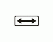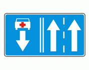 F-18 "przeciwny kierunek dla określonych pojazdów" Tablica ta wskazuje lewy pas ruchu przeznaczony tylko dla pojazdów określonych na znaku, poruszających się w kierunku przeciwnym.