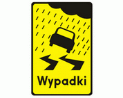 T-15 Tabliczka wskazująca miejsce częstych wypadków spowodowanych śliską nawierzchnią jezdni ze względu na opady deszczu.